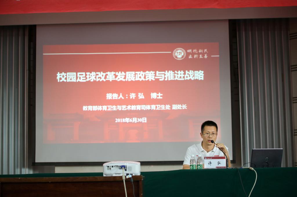 许弘代表教育部体卫艺司对所有来参加培训的骨干教师表示欢迎,并对校园足球现状作出了分析,并指出了未来的发展方向,夯实人才基础,发展青少年足球,全面推进校园足球发展。期望参训老师将此次学习和培训作为一个提高的良好机会,并对本期培训班提出要求,希望学员们重视此次培训,认真对待每一堂课,在理论上得到更好的充实,在实践上使自己的技术获得进一步的改进与完善,认真学习转变观念,多思多想多总结,形成好的教学方法。