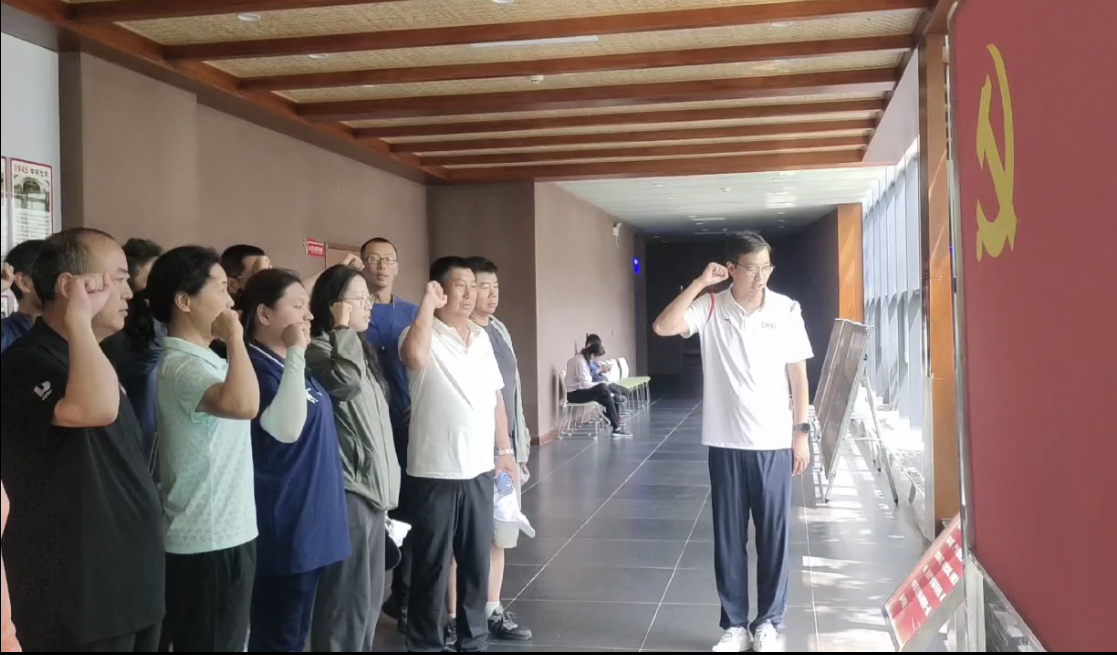 面对鲜艳的党旗庄严宣誓,重温入党誓词,将"不忘初心、牢记使命"的责任担当融入到铮铮誓言之中。