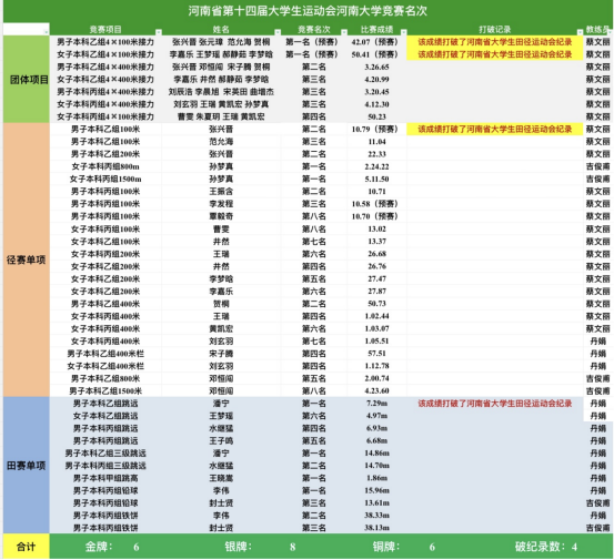 7月14日,由河南省教育厅、河南省体育局主办,河南省学生体育总会协办,河南省学生体育总会田径协会执行,洛阳师范学院承办的河南省第十四届运动会学生组田径比赛暨河南省第二十九届学生田径运动会(大学生组)开幕。经过5天激烈的角逐,永利田径代表队斩获6项冠军,8项亚军,6项季军,打破四项河南省高校田径记录,以152分、115分的总成绩,分别获得男子乙组总分第1名、乙组团体总分第2名,丙组成绩优异,同时永利荣获了“体育道德风尚奖”。