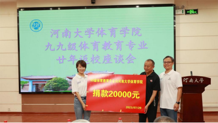 明德新民,止于至善,饮水思源,感恩母校。为反哺母校,感谢母校的培育之恩,助力母校建设发展,范东芳、程亚飞作为九九级体育教育专业毕业生代表向学院捐赠两万元,段廷良代表学院接受捐赠。