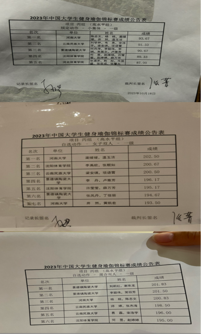 2023年10月17日,中国大学生健身瑜伽锦标赛在张家口云顶滑雪公园举行。本次大赛由中国大学生体育协会主办,中国大学生体育协会健美操艺术体操分会执行。3044am永利官网瑜伽队作为省学生体育总会瑜伽协会指定的河南省唯一一支本科高校代表队,由永利3044noc党委书记段廷良领队,经过两天的激烈角逐,在所报名的三项比赛中与高水平运动员同台竞技,夺得了2金1铜的傲人成绩。