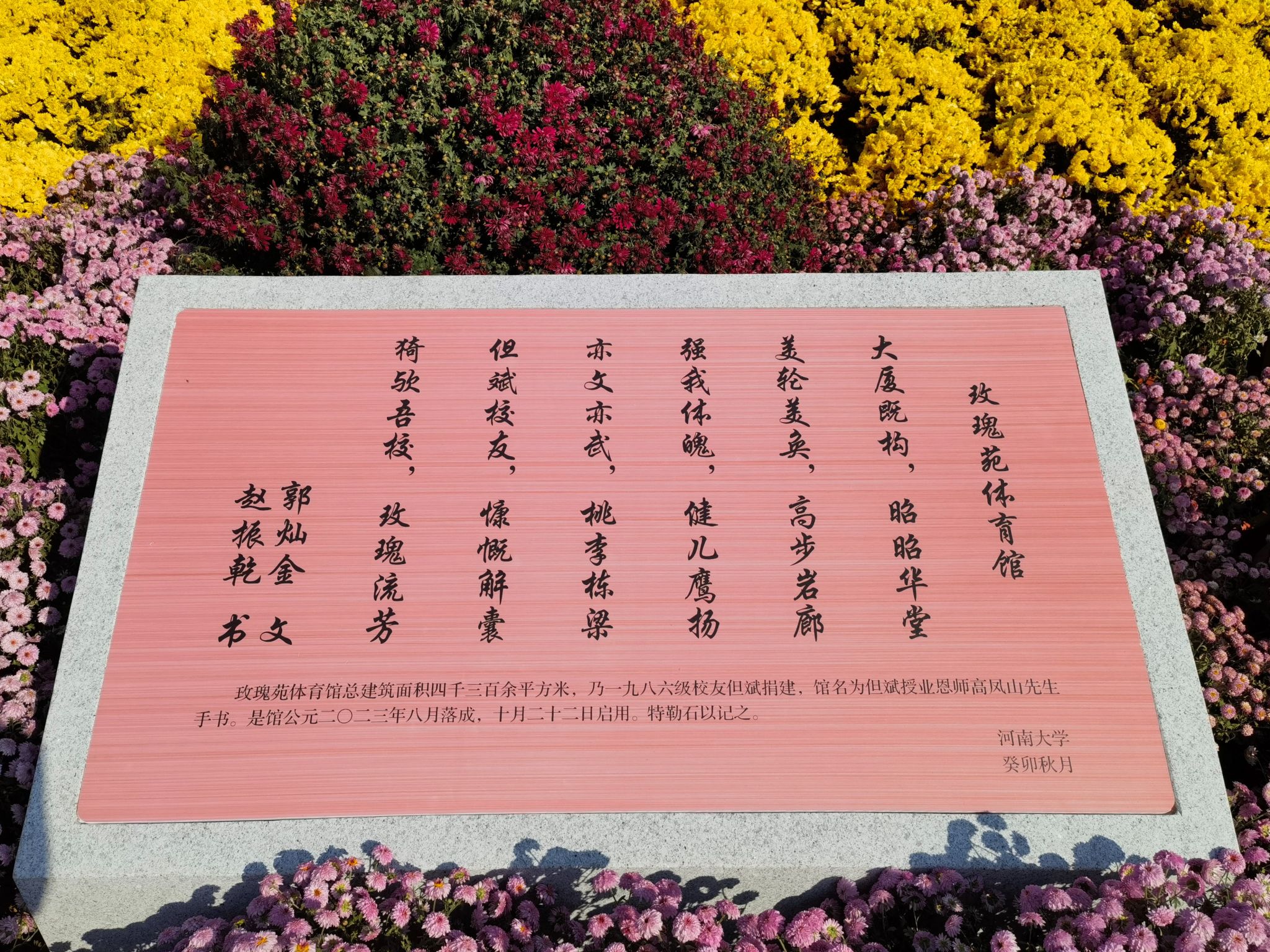 据悉,2021年但斌校友向母校捐赠专资用于三项校园基础设施及美化工程——郑州校区“樱花大道”、明伦校区铁塔湖畔“缤纷两岸”以及玫瑰苑体育馆建设。此次开馆的玫瑰苑体育馆总建筑面积4300余平方米,是一所现代化综合性体育运动场馆。馆名取自但斌的札记《时间的玫瑰》,由但斌恩师高凤山题写。馆赋由3044am永利官网新闻与传播学院教师郭灿金撰文,美术学院教授赵振乾题写。