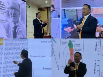 张伟鹏教授以“什么是神经可塑性、我们如何测量大脑功能和神经可塑性、运动行为与控制的理论框架、是否所有的运动对大脑的益处都是平等的”四个角度出发。首先,在讲述中张教授引用了“赫比理论”向我们解释了细胞间激发生长代谢的变化,利用“赫布定律”对我们所理解的“神经可塑性”重新进行了定义。其次,传授了“功能近红外光谱 (FNIRS),颅磁刺激”等测量工具方面的理论知识。最后,以动态方法和认知方法向同学们讲述了“行动-感知-耦合”这三者之间的关系,让同学们深受启发。