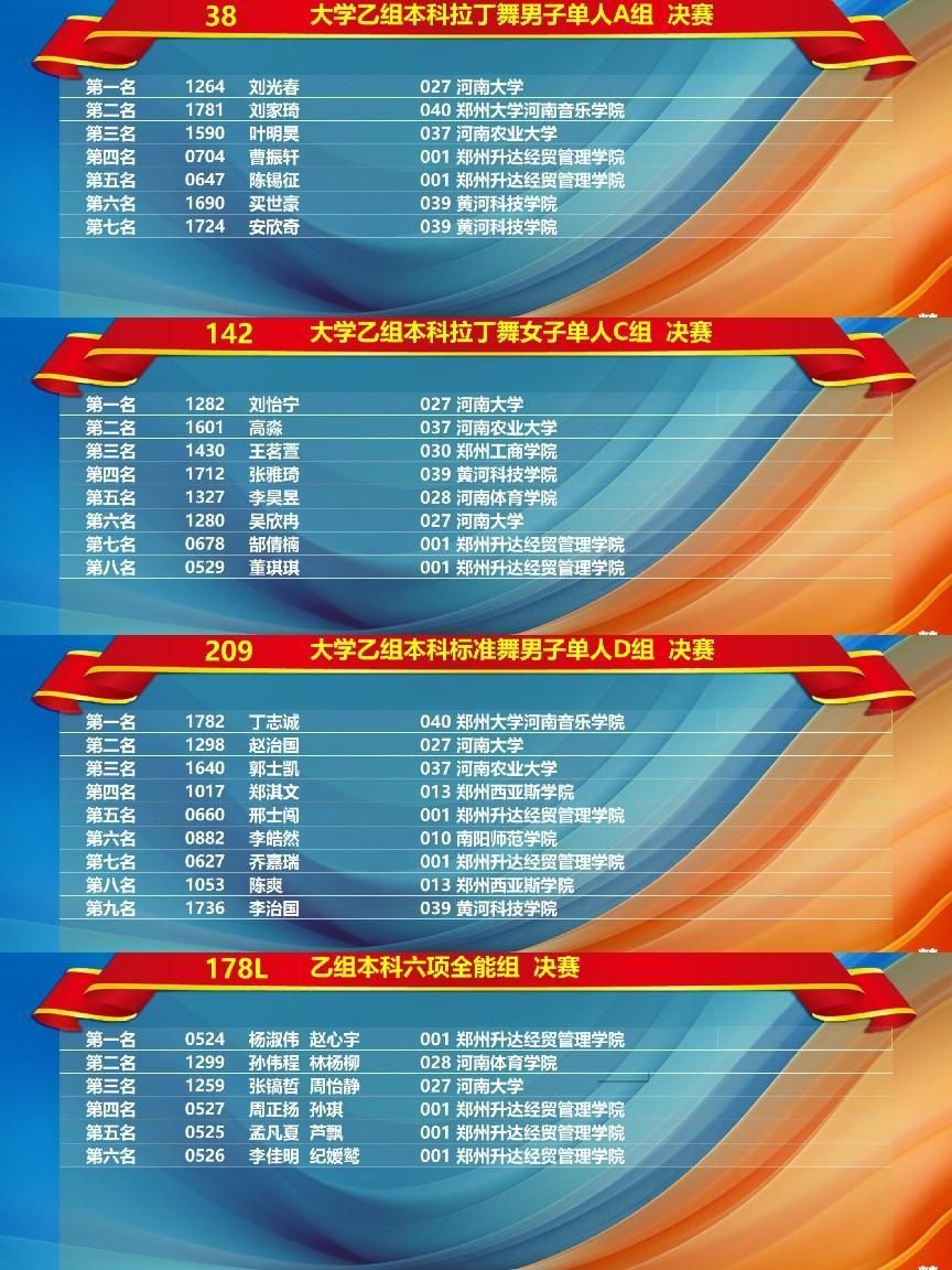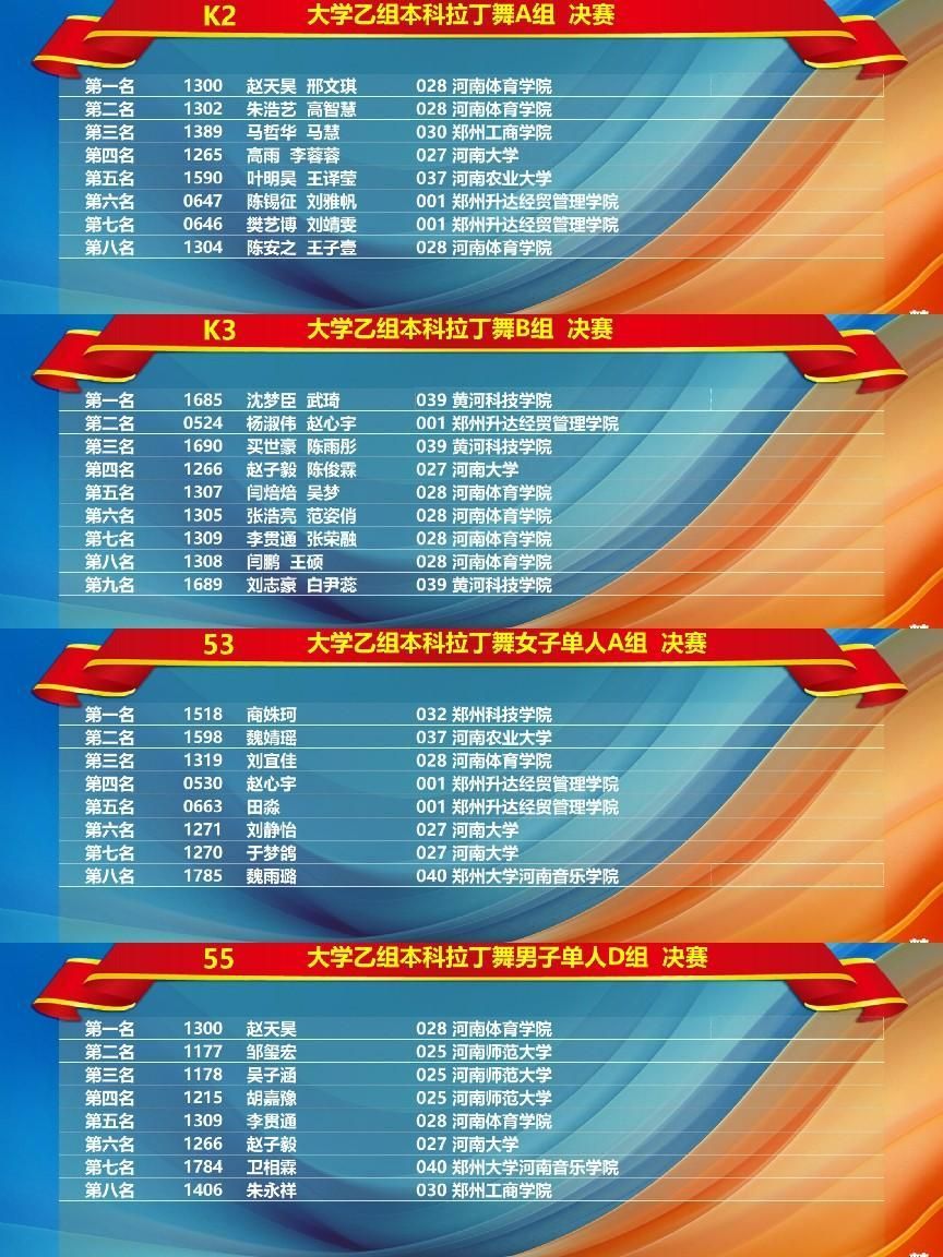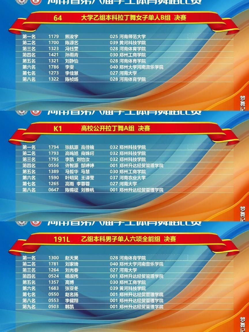 10月25日到10月27日,由河南省教育厅、河南省体育局主办,河南省学生体育总会协办的“河南省第八届学生体育舞蹈比赛”在郑州升达经贸管理学院隆重举行。来自河南省各地37所高校,1400多名运动员在100个比赛组别、2700多项次展开比拼。