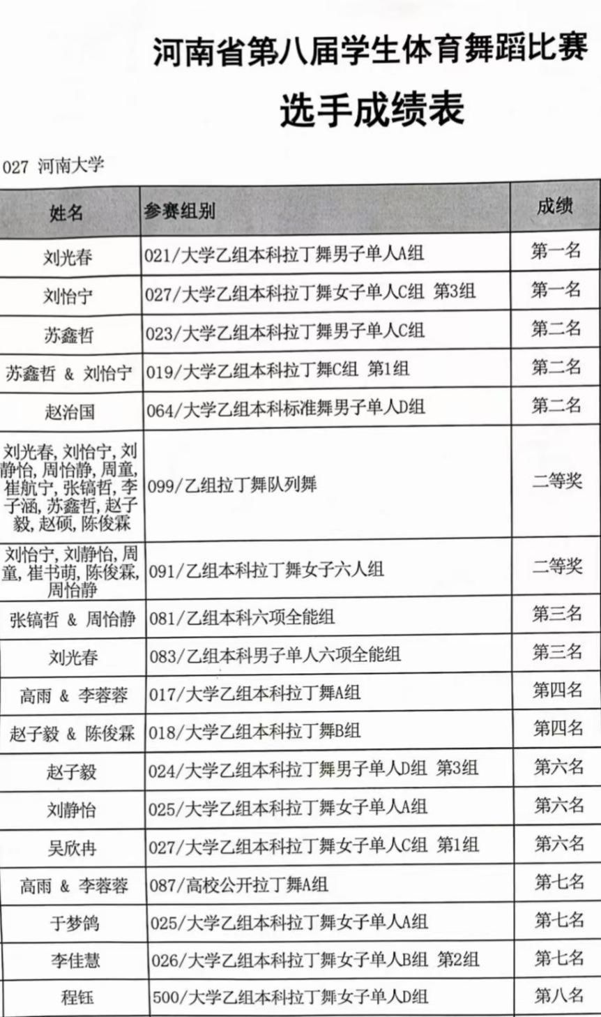 3044am永利官网体育舞蹈代表队在院领导的大力支持下,由永利3044noc党委书记段廷良担任领队,艺术系主任张笑笑担任教练员,参加了本届河南省学生体育舞蹈比赛。在三天的赛程中,队员们与河南省各大高校同台竞技,在赛场上顽强拼搏、勇于进取,经过层层比拼与激烈角逐,永利运动员共揽获两项冠军,五项亚军,两项季军,两项第四,三项第六,三项第七等优异成绩,展现出3044am永利官网代表队的风采及拼搏精神。