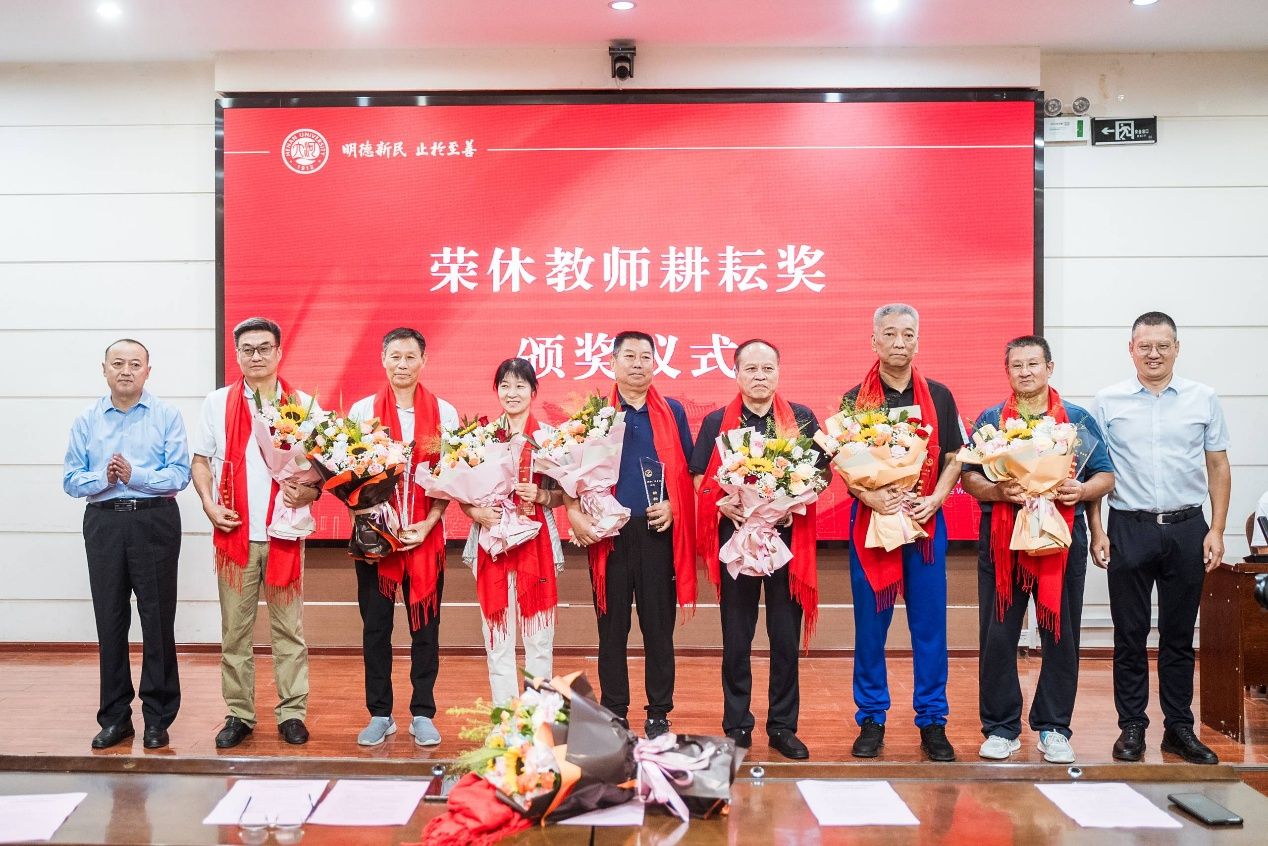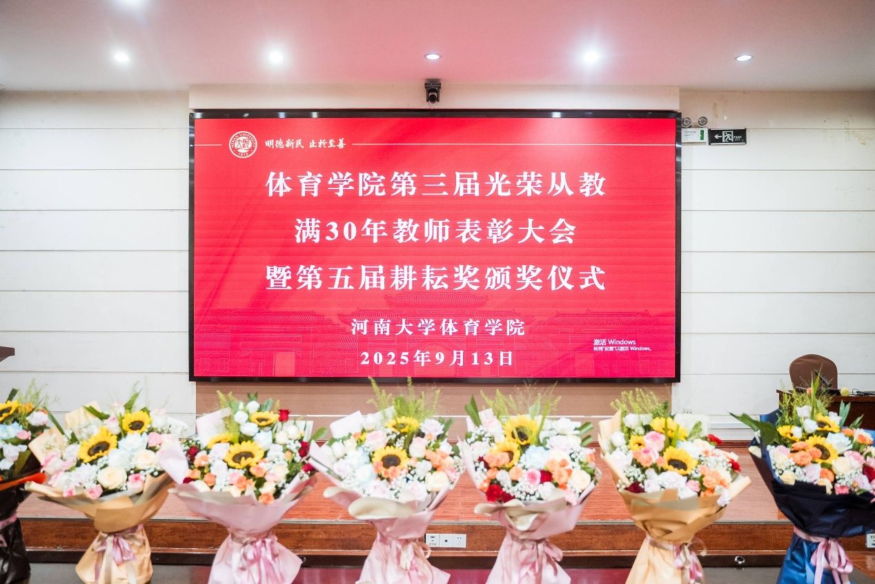 随着颁奖音乐响起,大会分别进行从教满30年教师表彰和第五届耕耘奖颁奖仪式环节,并由学院新进青年教师为受表彰教师们献上鲜花,当奖杯与鲜花递到教师手中时,现场响起阵阵掌声,每一份荣誉都凝结着他们在体育教育领域的坚守与付出,并将赓续传承。
