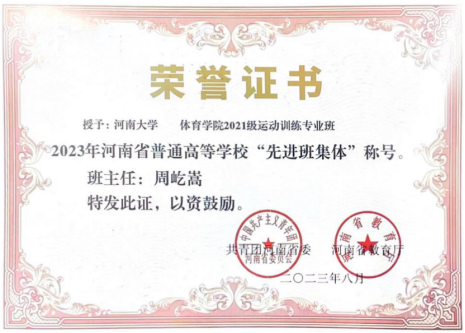 永利2021级运动训练专业班获2023年河南省高等学校“先进班集体”称号